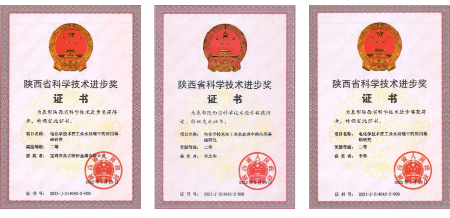陜西省人民政府頒布《關(guān)于2021年度陜西省科學(xué)技術(shù)獎(jiǎng)勵(lì)的決定》,經(jīng)省科學(xué)技術(shù)獎(jiǎng)各專業(yè)評(píng)審組評(píng)審、省科學(xué)技術(shù)獎(jiǎng)勵(lì)委員會(huì)審定和省政府常務(wù)會(huì)議審議,由西安交通大學(xué)牽頭,寶雞市昌立特種金屬有限公司共同完成的《電化學(xué)技術(shù)在工業(yè)水處理中的應(yīng)用基礎(chǔ)研究》項(xiàng)目被授予“省科學(xué)技術(shù)進(jìn)步獎(jiǎng)”二等獎(jiǎng)。